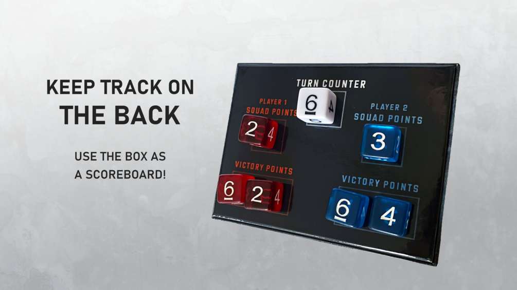 Dice: Yes yes, I know that you already have dice for rolling! However, these ones are intended for tracking soldier vitality and tallying points on the scoreboard (on the back of the box).